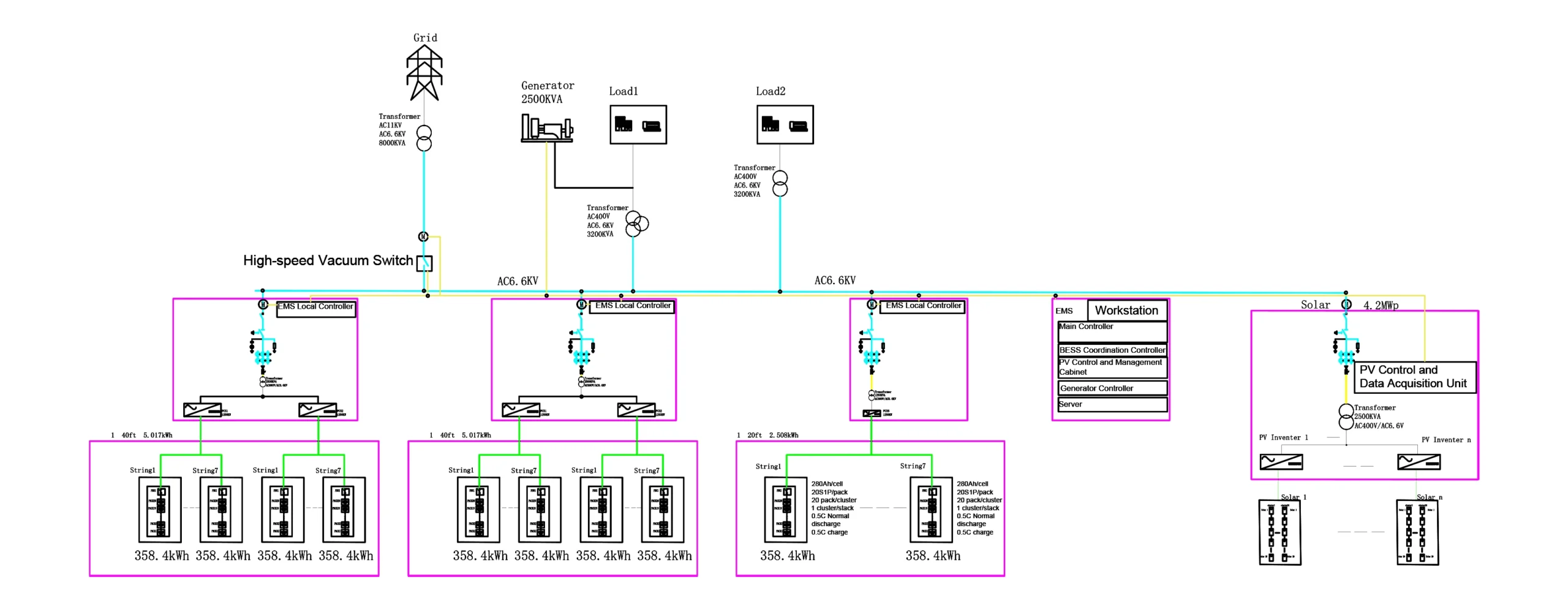 The system can switch to off-grid operation during grid failures, utilizing its integrated PV and energy storage to ensure power continuity for critical loads.